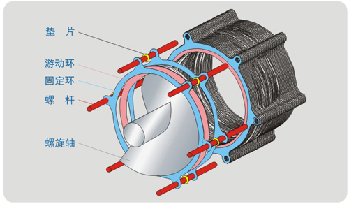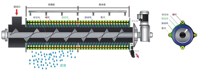 疊螺式污泥脫水機(jī)主體有多重固定環(huán)、游動(dòng)環(huán)和螺旋過濾部構(gòu)成,有機(jī)地結(jié)合了過濾濃縮技術(shù)和壓榨技術(shù),將污泥的濃縮和壓榨脫水工作在一筒內(nèi)完成;在濃縮腔內(nèi),它利用定、動(dòng)疊片間的相對(duì)游動(dòng),使濾液快速排出,永不堵塞;在脫水腔內(nèi)利用螺旋腔室內(nèi)體積的不斷收縮,增強(qiáng)內(nèi)壓及背壓板的調(diào)壓機(jī)理,以獨(dú)特微妙的的濾體模式取代了傳統(tǒng)的濾布和離心的過濾方式,其先進(jìn)固液分離和自清洗技術(shù)將開創(chuàng)污泥脫水的新時(shí)代。